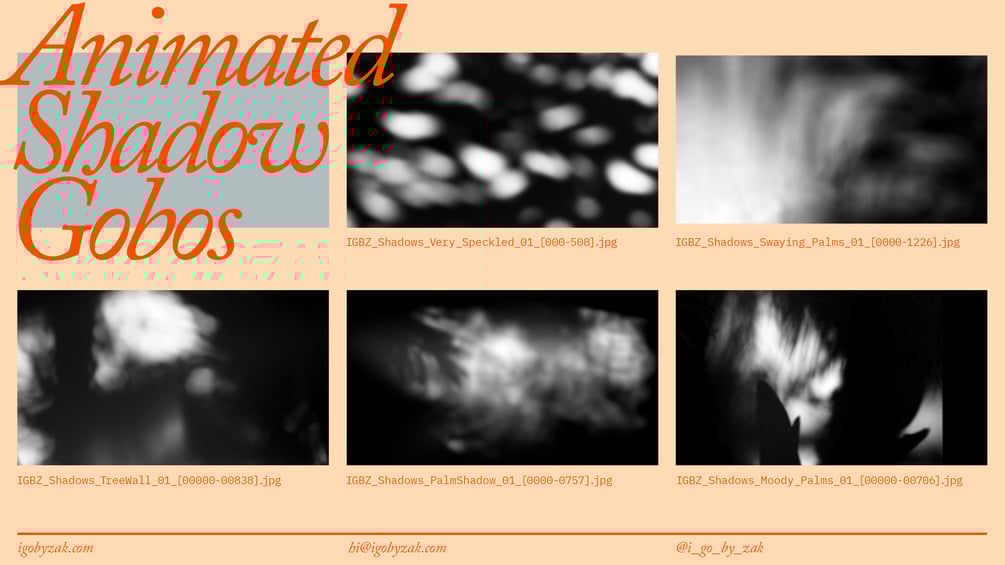 Hey all! Here's a free pack of 5 looping, jpg sequence shadow gobos you can use for your renders. I shot these myself from real world shadows on interior walls, so you know, these are legit shadows. Use these for whatever you like, personal or commercial; just don't sell these.